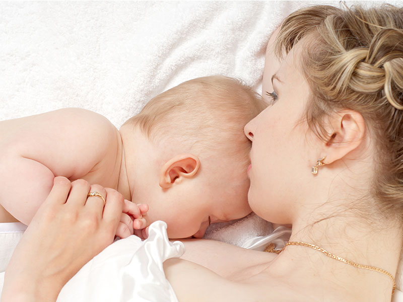 Cette position place les 2 corps face à face, couchés sur le côté. Elle est pratique pour un repos complet en même temps que l’allaitement et peut être très utile pour les tétées nocturnes. Pour les mères ayant eu une césarienne ou qui ont des douleurs particulières, cette position est parfaite puisqu’elle “n’impose” pas de charge à la mère ni de pression sur le ventre.